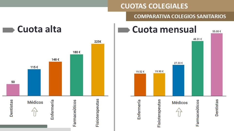 La cuota colegial es de 82€, de carácter trimestral; esto es, 27,33€/mes. Si se compara con otras profesiones sanitarias de la provincia, el Colegio de Médicos de Las Palmas tiene una cuota proporcionada. Como se puede comprobar en la imagen, la cuota de los farmacéuticos asciende a 48,31€ y la de los dentistas, a 55€, más del doble que la nuestra.