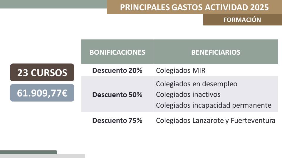 Los cursos del Colegio, diseñados exclusivamente como talleres, se ofertan a los colegiados a un precio muy por debajo del mercado. Aun así, además, se ofrecen descuentos en las matrículas a diferentes colectivos de colegiados. Cabe mencionar las importantes ventajas para los colegiados de Lanzarote y Fuerteventura: horarios y días especiales, gastos de avión y de alojamiento, y el máximo descuento ofrecido, un 75% en la matrícula.