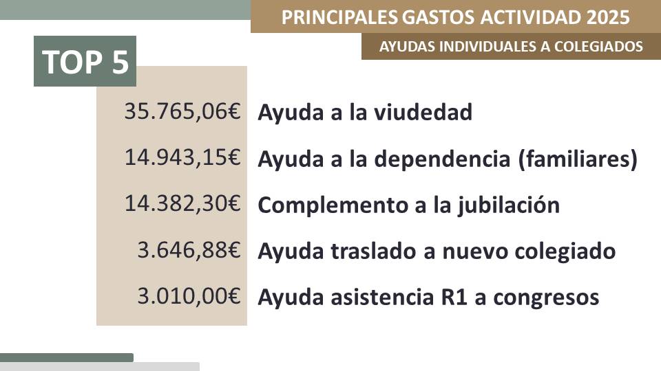 Las cinco ayudas individuales a colegiados más solicitadas en 2025 han sido: ayuda a la viudedad, dependencia (familiares), complemento a la jubilación, traslado a nuevo colegiados y asistencia R1 a congresos.
