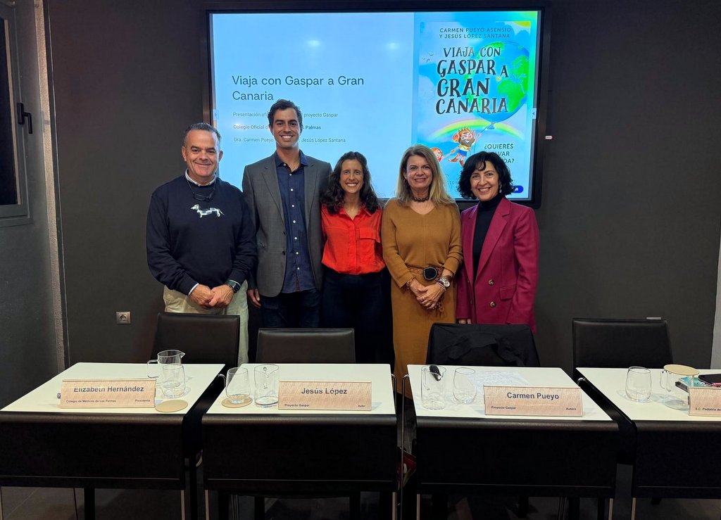 Elizabeth Hernández, presidenta del Colegio, participó en la presentación del libro Viaja con Gaspar a Gran Canaria, primer título del proyecto educativo “Salva vidas con Gaspar”, impulsado por los colegiados Carmen Pueyo y Jesús López. En esta iniciativa han colaborado la Sociedad Canaria de Pediatría, la ONG Mary’s Meals y el Colegio, con el objetivo de transformar la enseñanza de los primeros auxilios en una experiencia narrativa ambientada en escenarios emblemáticos de Gran Canaria.
